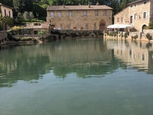 Lasciamo le colline in direzione sud. La “strada culto” è la SP 438, verso Asciano. Qui il paesaggio è totalmente diverso. Bassi colli brulli segnati dalla strada che li attraversa come una biscia stesa al sole. Qui e là cipressi più o meno solitari, a volte in filari. I solchi dei calanchi tagliano le colline creando un paesaggio lunare. Uno spasso da guardare, e, soprattutto, da guidare. Un invito ad “aprire” un po’. Iniziamo ad avere un certo appetito. Ci starebbe bene una di quelle osterie sulla strada, con un piccolo patio ombreggiato e le tovaglie a quadretti bianchi e rossi. Detto fatto. La troviamo vicino ad un punto panoramico ad una decina di km da Asciano. Una bruschetta e un piatto di pici all’aglione non ce li toglie nessuno! Ben ristorati ripartiamo verso la Val d’Orcia, la nostra prossima tappa. Prima sosta a Bagno Vignoni, dove non si può non fermarsi affascinati davanti alla piazza-piscina al centro del borgo. E poi San Quirico d’Orcia, Pienza, Castiglione d’Orcia. Siamo quasi alle pendici dell’Amiata che osserviamo laggiù, imponente e austero. Il nostro agriturismo ci aspetta.